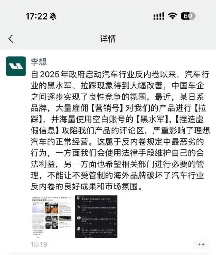 4月11日下昼,理思汽车创举东谈主李思一又友圈发文,某日系品牌大量雇佣“营销号”“黑水军”对理思的家具进行拉踩,严重影响理思汽车的平日策动,并叱咤“这属于反内卷章程中最恶劣的举止”。