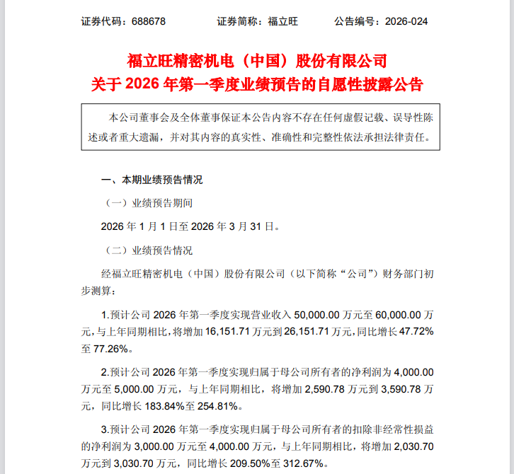 3月11日盘后,专注精密金属零部件的福立旺(688678)败露了一份功绩预喜的2026年一季度功绩预报。