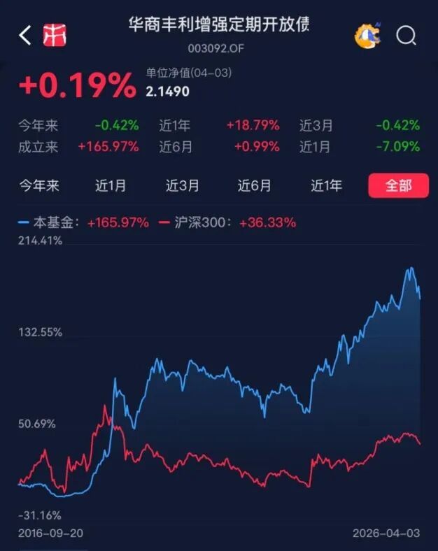 不雅察这只基金,最直不雅的感受是其事迹发扬更像一只职权类居品。截止2026年4月3日,该基金缔造以来的累计呈报达到166%,而同时沪深300指数的涨幅为36%,逾额收益显赫。