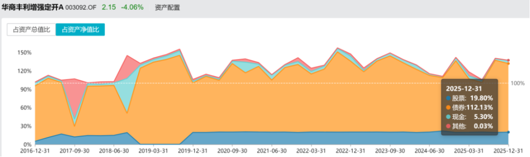 截止2025年底,该基金的金钱组合中,债券占比为112%,股票占比为20%。天然名义上看是一只以债券为主的基金,但穿透债券捏仓明细不错发现,该居品的皆备中枢是可转债。